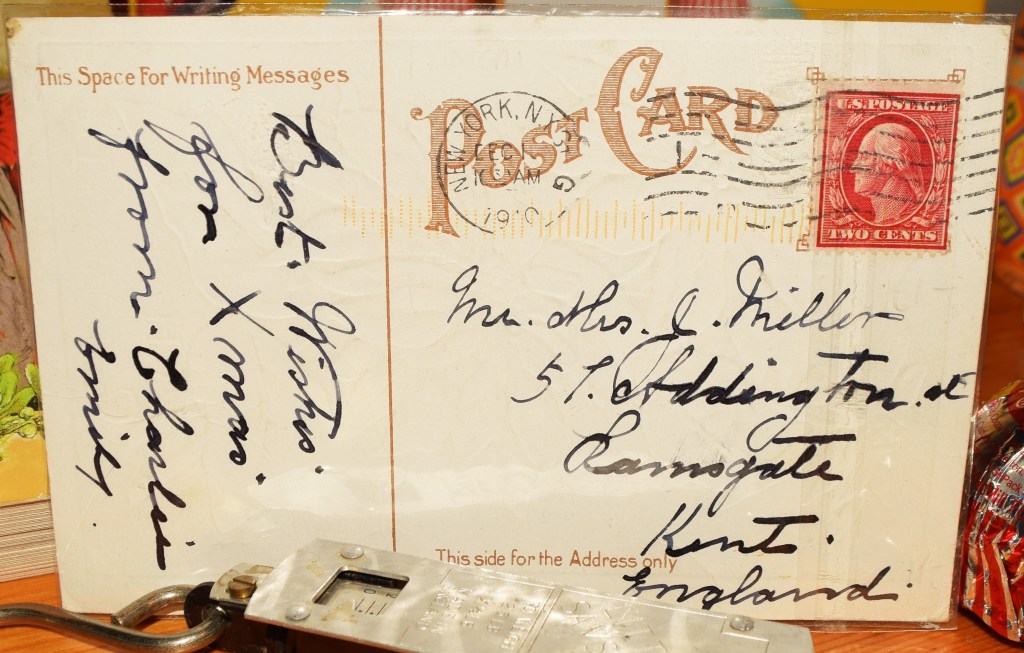 You should be careful about letting the past into your life. What starts as a trickle soon becomes a rich stream and like all rivers- it will occasionally flood. This time last year, I received a Christmas postcard from New York. The postage stamp shows it was sent in 1910 by ‘Charlie and Emily’ and addressed to a ‘Mr and Mrs J. Miller’. The card arrived at our house in Addington Street, Ramsgate on the 23rd December 2016, bringing with it the final flurry of Christmas post… As well as the first of several ghosts.